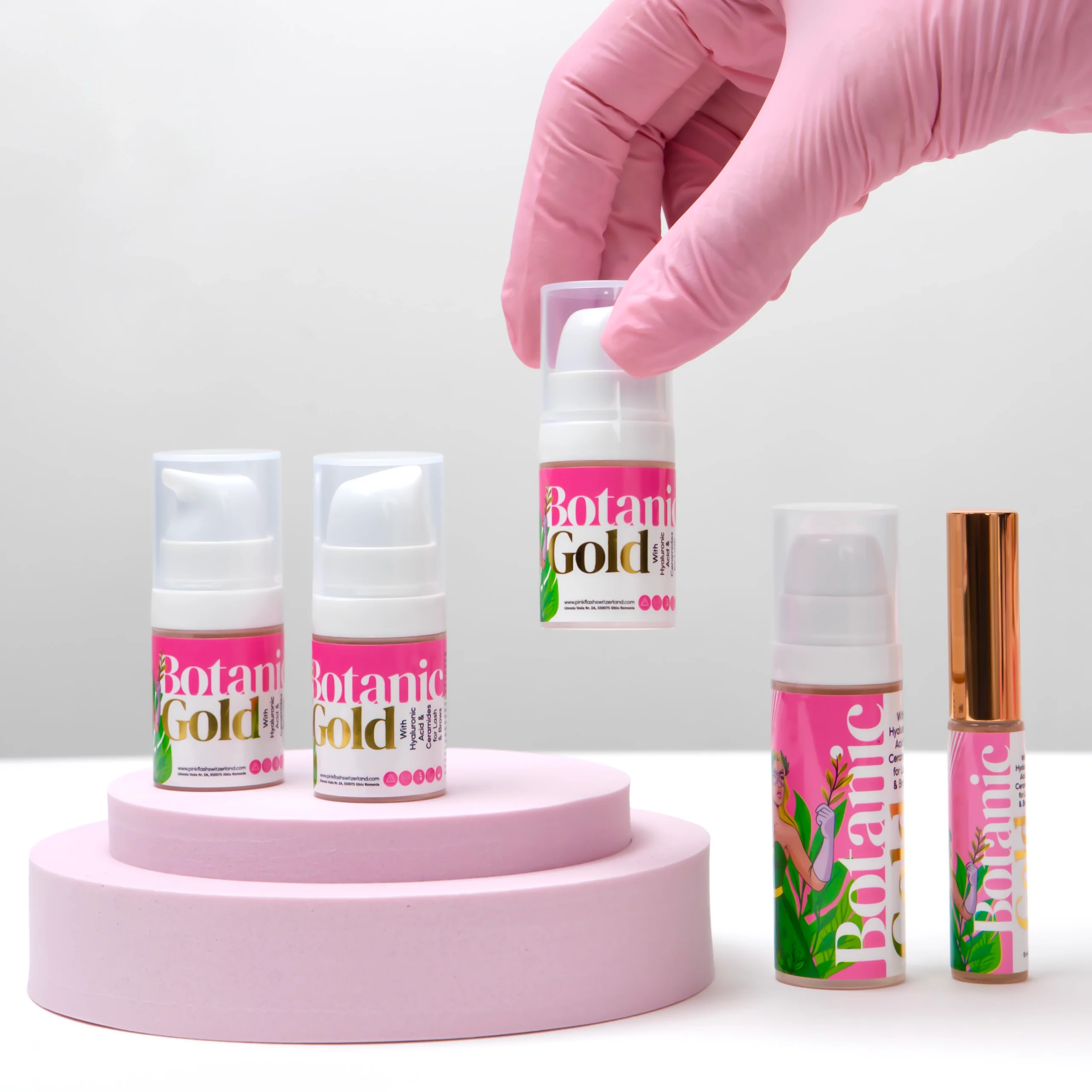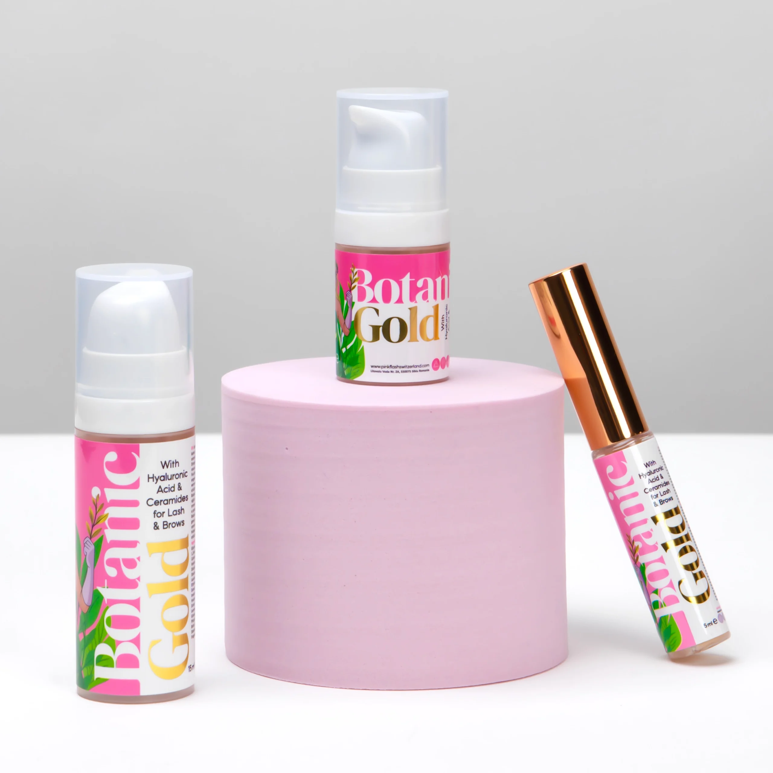 BOTANIC GOLD é um poderoso sérum de cuidado diário pós-tratamento de Lash Lifting e Brow Lamination, com ácido hialurônico, ceramidas e mais de 10 extratos botânicos, com uma textura dourada cintilante e glitter cosmético para um acabamento inesquecível.